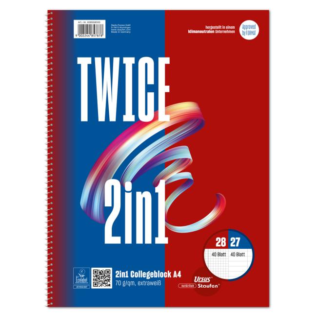 Vysokokvalitný blok formátu A4 dva v jednom. S kovovou bočnou špirálou, vyrobený z recyklovaného papiera s hmotnosťou 70 g / m².