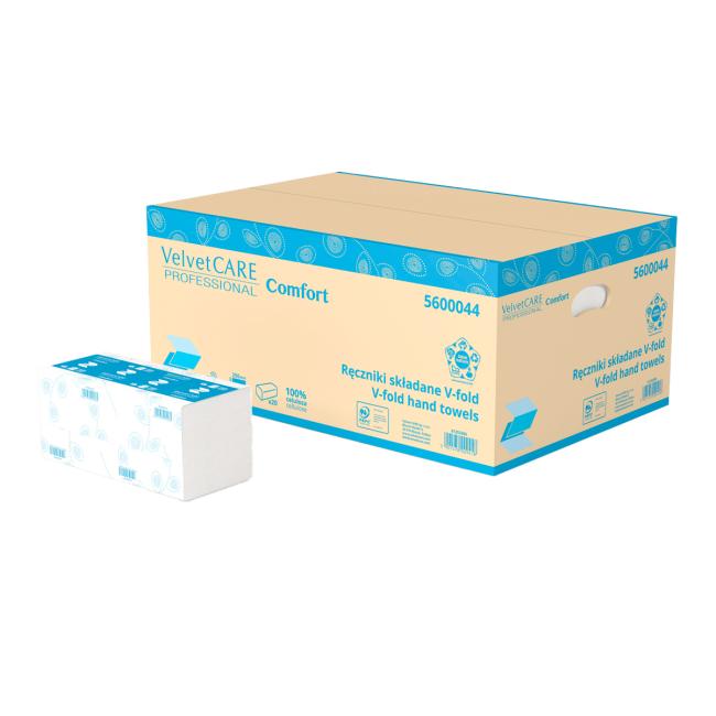 Mäkké, pevné a savé uteráky Velvet CARE Professional V Fold 23×25 cm – 100% celulóza, 2 vrstvy, 150 ks v balení, 3000 ks v kartóne (20×150 ks)