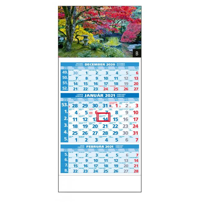 Rozmery: 295 x 663 mm. ROZSAH: 12 listov. KALENDÁRIUM: 3-mesačné s menami SK+CZ názvy mesiacov a dní v SK, CZ, UK, DE, HU. VÄZBA: šitá s perforáciou. REKLAMNÁ POTLAČ: 295 x 60 mm. BALENIE: 50 ks.